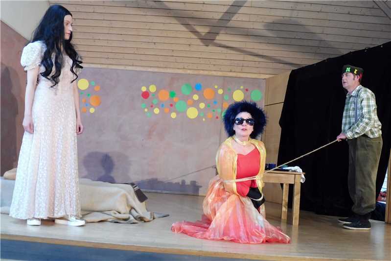 „Wir sind keine Freunde pompöser Ausstattungen“, erzählte die Theaterpädagogin und Tanztherapeutin, „wir richten das Hauptaugenmerk auf die Botschaft.“ Als Kulissen dienten deshalb lediglich eine schwarze Stoffwand, ein angedeuteter Laufsteg für die Auftritte der Königin, eine spartanische Matratze und ein schlichtes Tischchen im Heim der Zwerge.