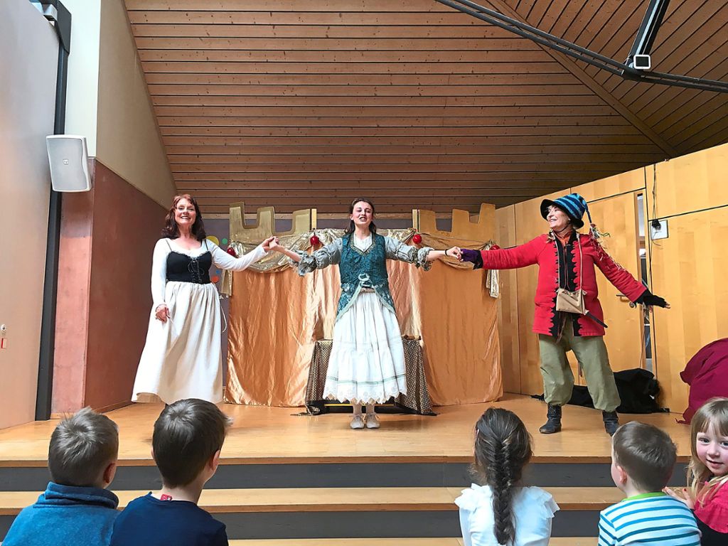Die Schauspielerinnen Dorothee Jakubowski, Pina Bucci und Clara Cazzanelli, unterstützt von Techniker Andreas Schnell, schlüpften in die Rollen des bekannten Märchens. Erwartungsvoll nahmen die kleineren und größeren Zuschauer in der zum Theatersaal umfunktionierten Aula Platz. Nach einer kurzen Begrüßung durch Schulleiterin Susanne Kökert startete die Theatercrew musikalisch mit Gitarre, Trommel und Rasseln in die Geschichte um die arme Müllerstochter, die Stroh zu Gold spinnen sollte.
