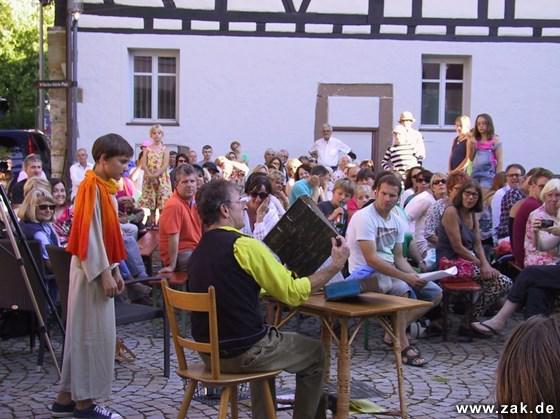 „Das Chamäleon" überzeugte mit einem beeindruckenden, sehr lebendigen Werk und detailreichen Kostümen...es nutzte das ganze Areal aus, der historische Marktplatz wurde zur Kulisse. Gespielt wurde auch auf der Stadtmauer und aus einem Fenster des Rathauses...