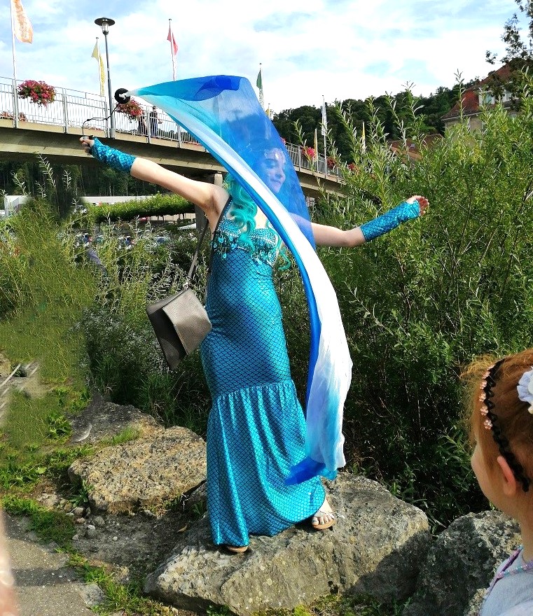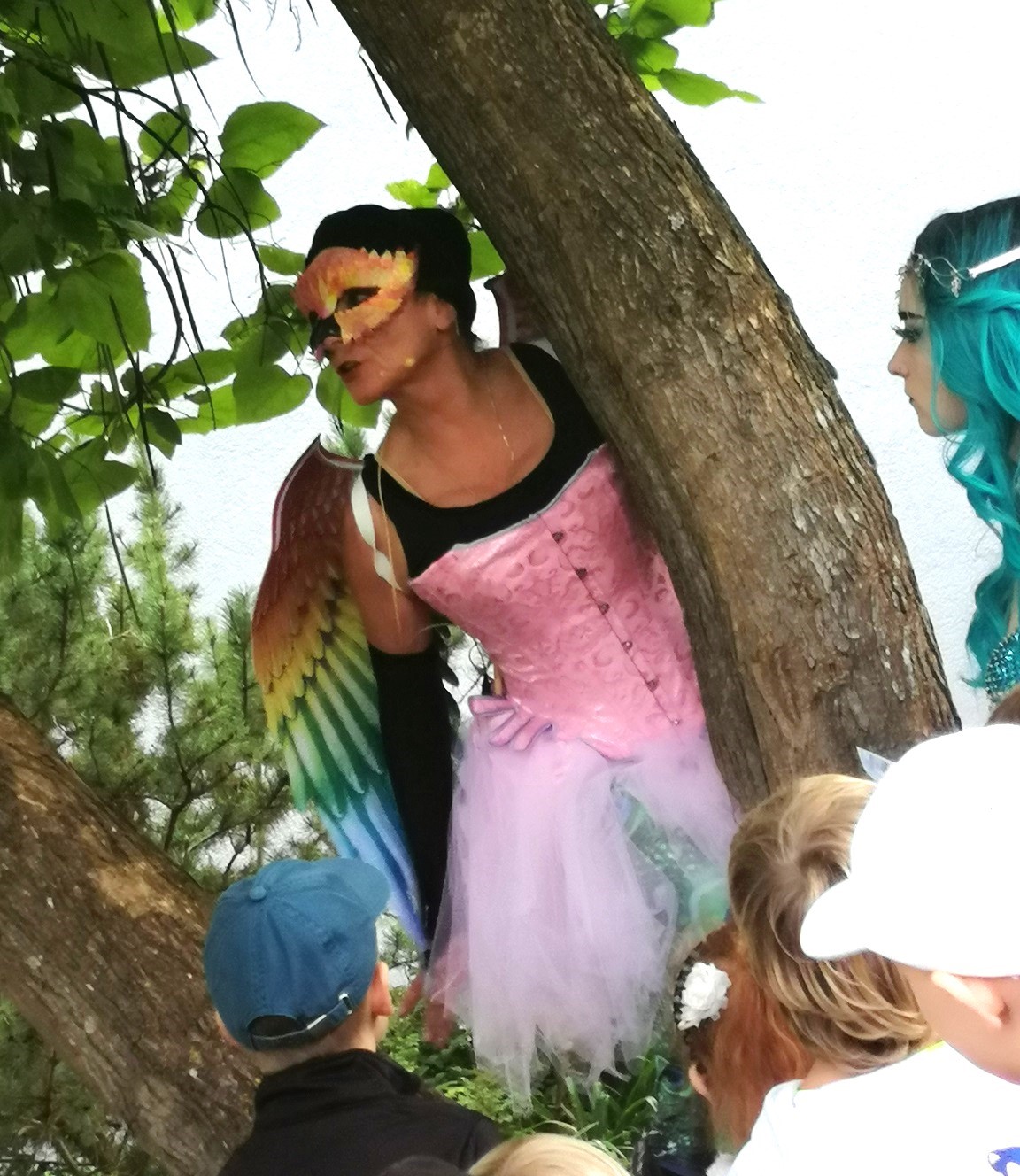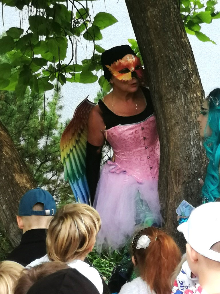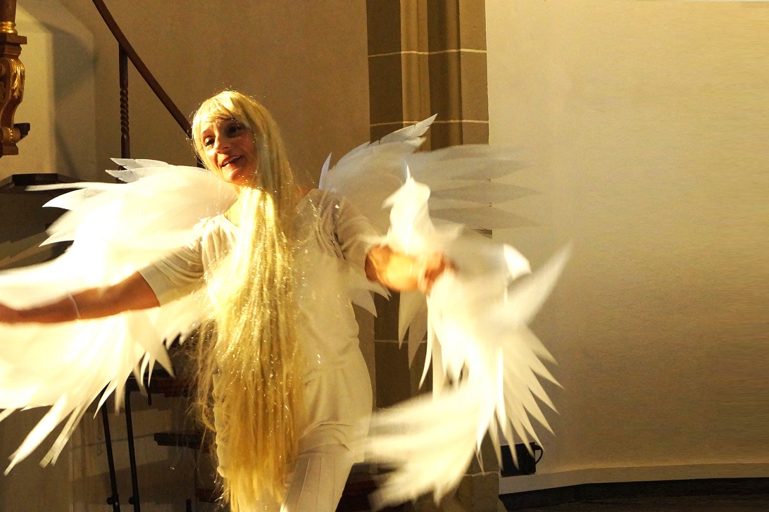 Pina Bucci und Dorothee Jakubowski bezauberten mit ihrer Performance „Träume vom Fliegen“ wie schon beim Theaterfestival. Die beiden Schauspielerinnen hatten sich in duftiger Pastellgaze zu Paradiesvögeln verwandelt, die durch das Gelände schwebten, von Hans-Jürgen Sesterheim am Saxophon einfühlsam begleitet.